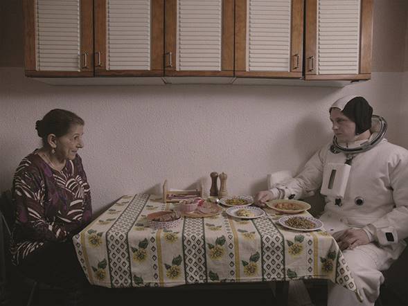 映画のハイライトとなるペアは、空から落ちてきたNASAのアメリカ人飛行士ジョン・マッケンジーと団地のアラブ系老女マダム・ハミダである。互いに英語とフランス語しか話せなくて、コミュニケーションも言葉だけでは交わせず、国籍も年齢も性別も全く異なる二人が、人種、文化、国籍、年齢、ジェンダーのあらゆる壁を破って、人間同士として心を通わせる。フランス郊外の老朽化した団地の屋上に地響きと共に不時着した宇宙船から出てきたのは、NASAの宇宙飛行士ジョン・マッケンジー。NASAの計画ミスによって地球帰還を余儀なくされたジョンは、電話を拝借した団地に住むアラブ移民のハミダ夫人に匿われる。ハミダ夫人の服役中の息子の部屋と服をあてがわれたジョンは、慣れないアラブ料理クスクスに舌つづみを打ち、TVを見て、絵やジェスチャーを介して交流をはかる。スムーズな異文化交流の鍵を握るのは、言葉の他には、料理であり、画像であり、ジェスチャーであることがわかる。うちとけたところで、NASAから迎えがやってくる。ジョンは、夫人お手製のタッパに入れたクスクスを土産にもたされて、かぐや姫のように天に舞い戻っていく。