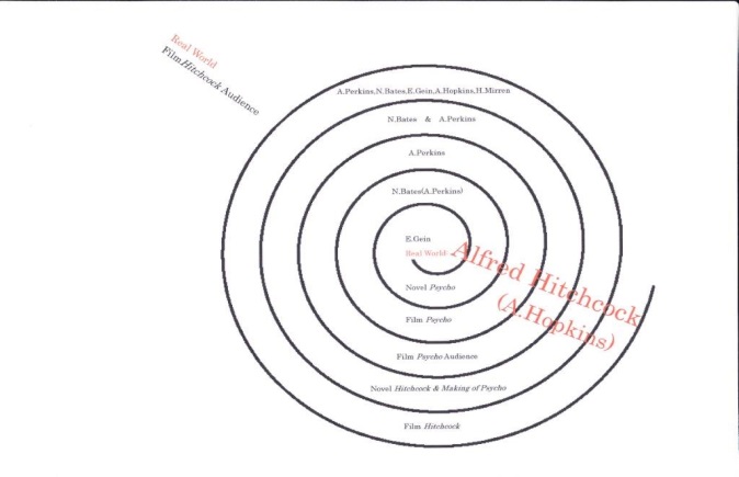 外枠の映画『ヒッチコック』に内在する映画『サイコ』とその原作の小説のさらに内部にかくまわれた実在の殺人鬼エド・ゲインが形式的時間的順列を破って、映画の冒頭のシーンに姿を現す。