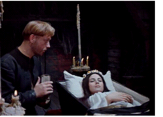 2.次は、老婆が魔法を使って化けた、領主の若い娘。彼女は、真っ白な肌にバラ色の頬、豊かな長い黒髪、大きな神秘的な黒い瞳をもった絶世の美魔女白雪姫はこんな人だったのではなないかと思わせる美しさである。